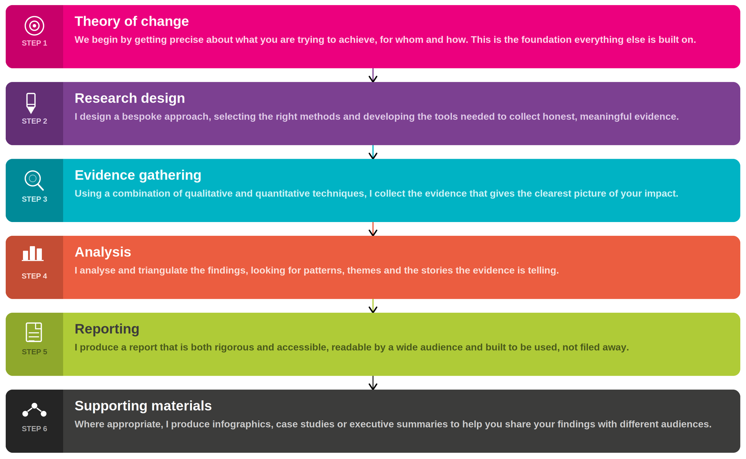 I design and deliver bespoke impact measurement projects for organisations across the private, public and third sectors. Every project is independent, which matters: the findings carry more weight when they come from someone with no stake in the outcome. Every project is also designed from scratch, because no two organisations are measuring the same thing.